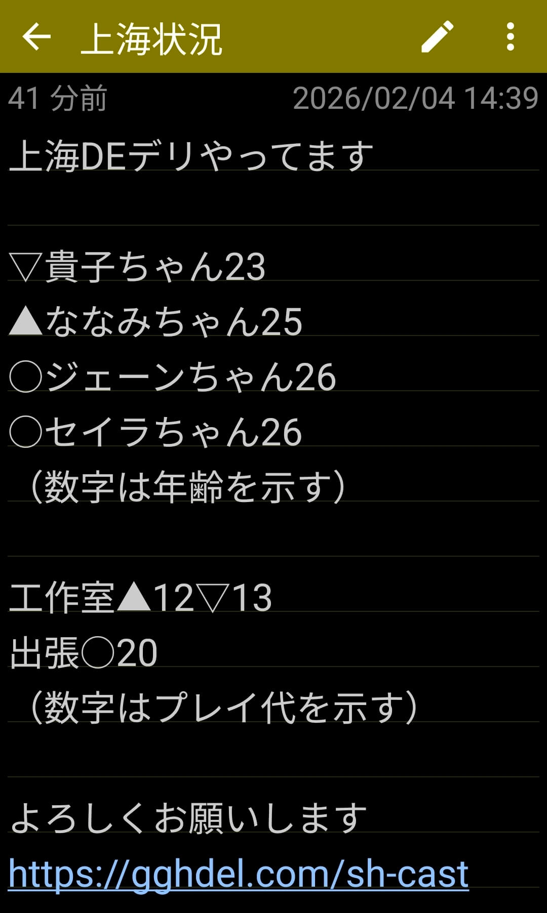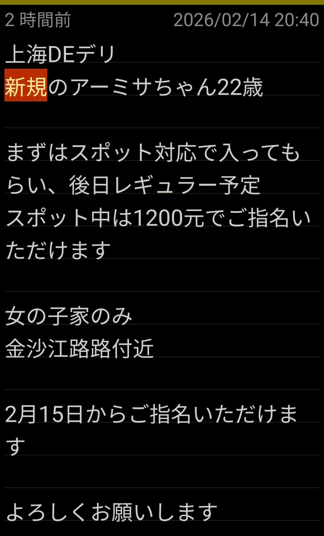 【上海DEデリヘル】電話受付は9時から22時まで。メールは24時間。不定休。定休は事前に告知します。安全上の理由により深夜派遣はいたしておりません。