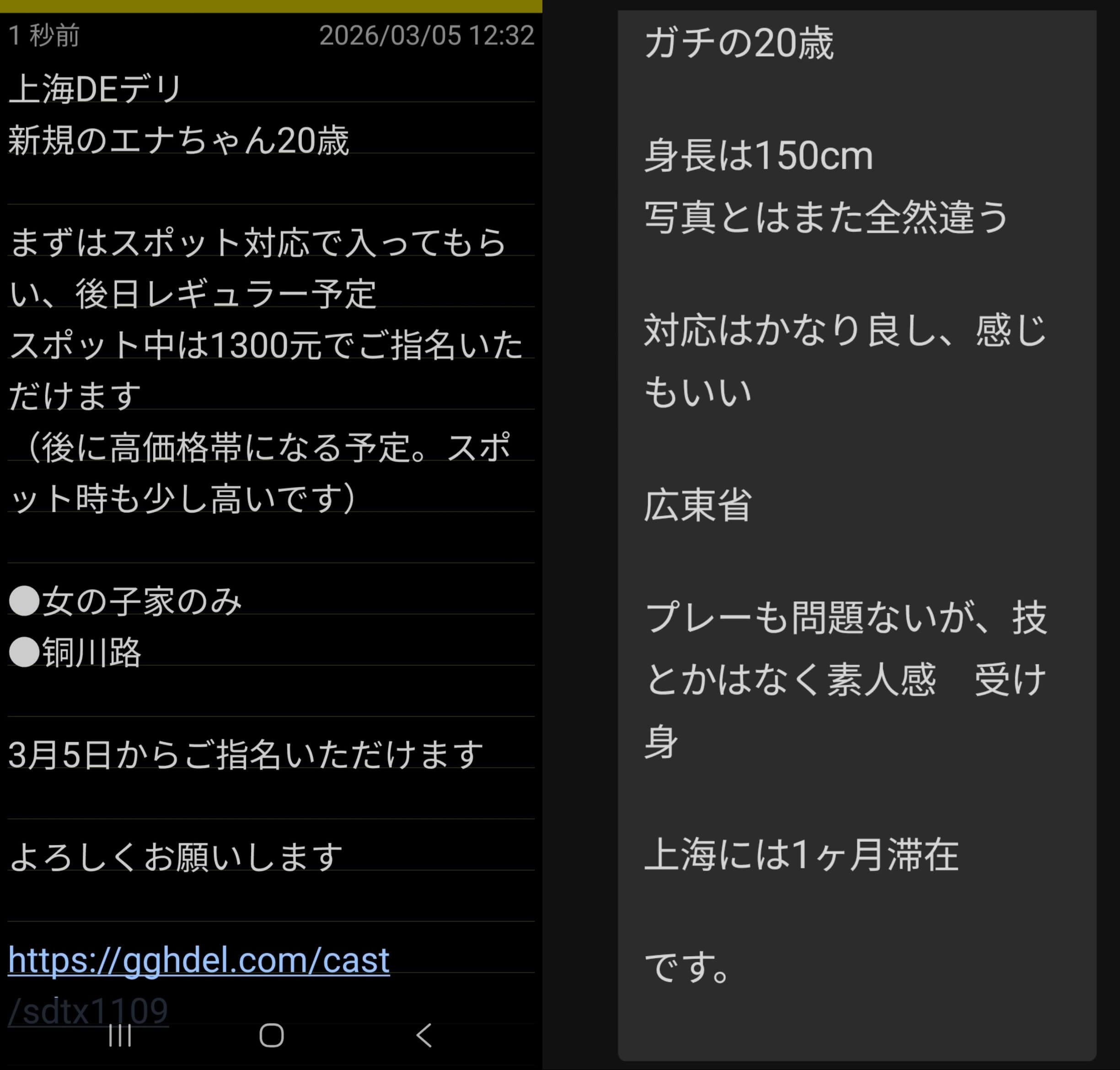 コンセプトは、普通の子/普通のサービス/普通の価格です。超極上の美女と濃厚プレイでなくても、普通に一発抜ければいい、というのが上海DEデリヘルのポイントです。